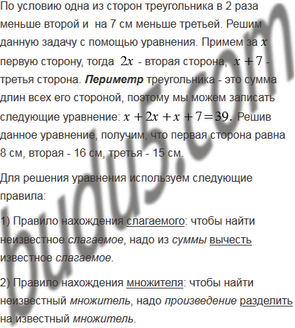 Одна из сторон треугольника в 2 раза меньше второй и на 7 см меньше третьей. Найдите стороны треугольника, если его периметр равен 39 см.
