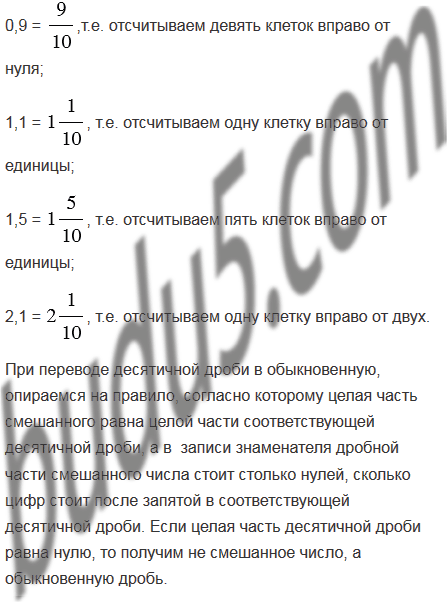 Начертите координатный луч, взяв за единичный такой отрезок, длина которого в десять раз больше стороны клетки тетради. Отметьте на луче точки, соответствующие числам 0,3; 0,7; 0,9; 1,1; 1,5; 2,1.